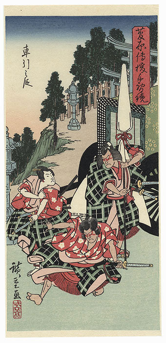 Carriage Stopping - This series by Hiroshige illustrates a kabuki play based on the life of the great scholar Sugawara no Michizane, who became a high-ranking minister to the Emperor. Falsely accused of plotting to seize power, Sugawara was exiled and ended his last years writing poems in calligraphy. This print shows the three triplet brothers who are godsons of Sugawara. Umeomaru and Sakuramaru have lost their masters because of actions by Shihei, their brother's lord. While waiting to ambush Shihei, who is Sugawara's rival, they encounter their brother Matsuomaru. A fight breaks out and the brothers tear the carriage apart. An expressive image of this dramatic meeting.