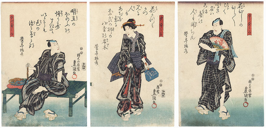 Comments - Handsome scene of three kabuki actors enjoying the evening cool. At left, Ichikawa Danjuro VIII relaxes on a bench with a pipe in hand, one geta clog kicked off with his leg pulled up. In the center, Bando Shuka I smiles back at him, a folding fan in hand. Her red under robe is visible beneath her sheer kimono. At right, Matsumoto Kinsho I scowls as he watches the beauty, a folding fan in hand and a blue cloth draped over his shoulder. Nice expressive figures, with soft shading in the background.